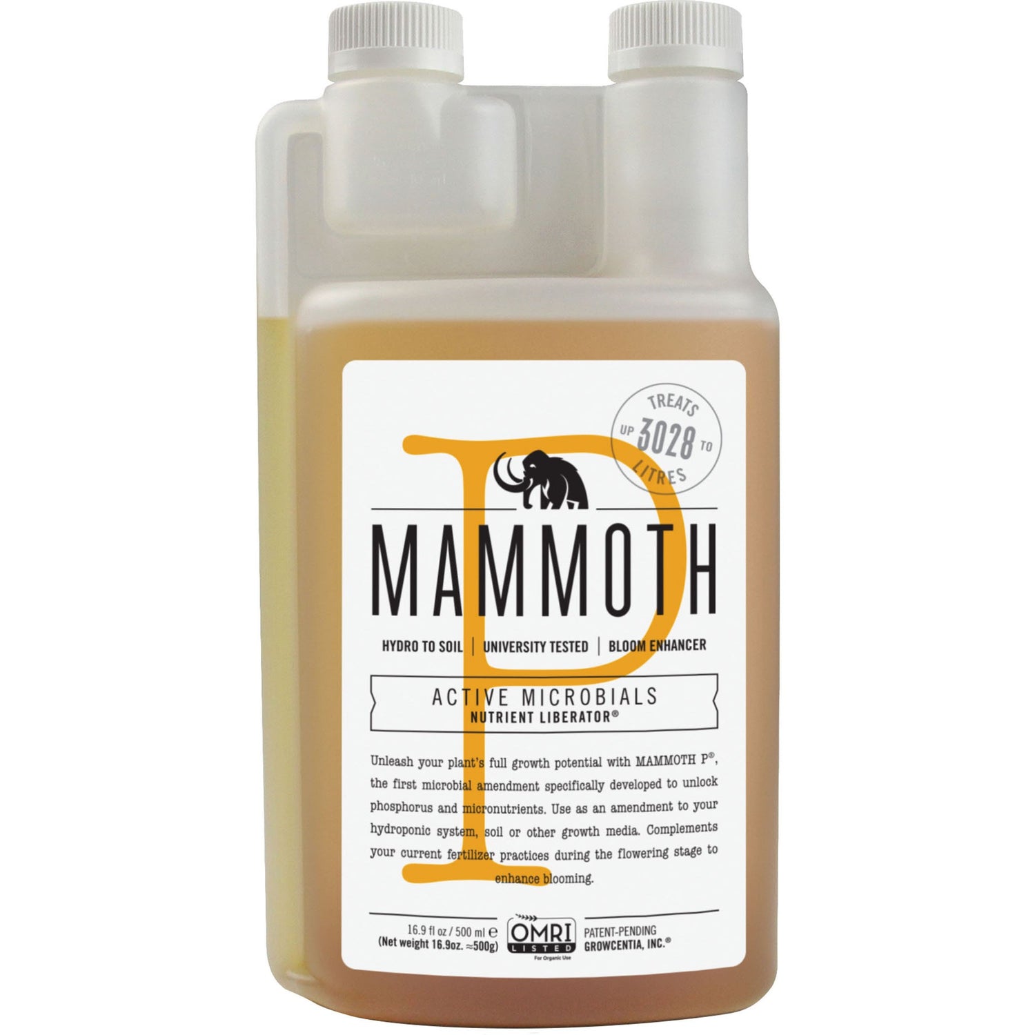 MAMMOTH P increase phosphorus uptake MAMMOTH P is the first organically derived microbial inoculant for growing plants that maximizes phosphorus and micro-nutrient cycling to maximize bud growth, increase yield, and enhance plant health. MAMMOTH P was developed by Growcentia’s founders at Colorado State University using nextgeneration technology. MAMMOTH P has been tested extensively by Colorado growers and independent labs have proven to increase plant growth. All production is done at our facility in Fort Collins Colorado to maintain the highest level of quality control. This beneficial bacterial formula works great in soil, soilless, and hydroponic systems. Using MAMMOTH P in hydroponic systems is an excellent way to introduce the organic benefits of soil microbial nutrients without sacrificing water quality. MAMMOTH P was engineered to supplement any fertilizer program. MAMMOTH P is specifically designed to increase phosphorus availability during the bloom phase, and should be used as a supplement to your regular fertilization program. Application during clone and vegetative phase will boost effectiveness. MAMMOTH P has a near neutral pH formulation and runs clean in any system. Our bacteria act as micro-bioreactors, constantly producing a more diverse suite of enzymes that enhance nutrient availability than the leading enzyme-specific products. Effective in All Media.